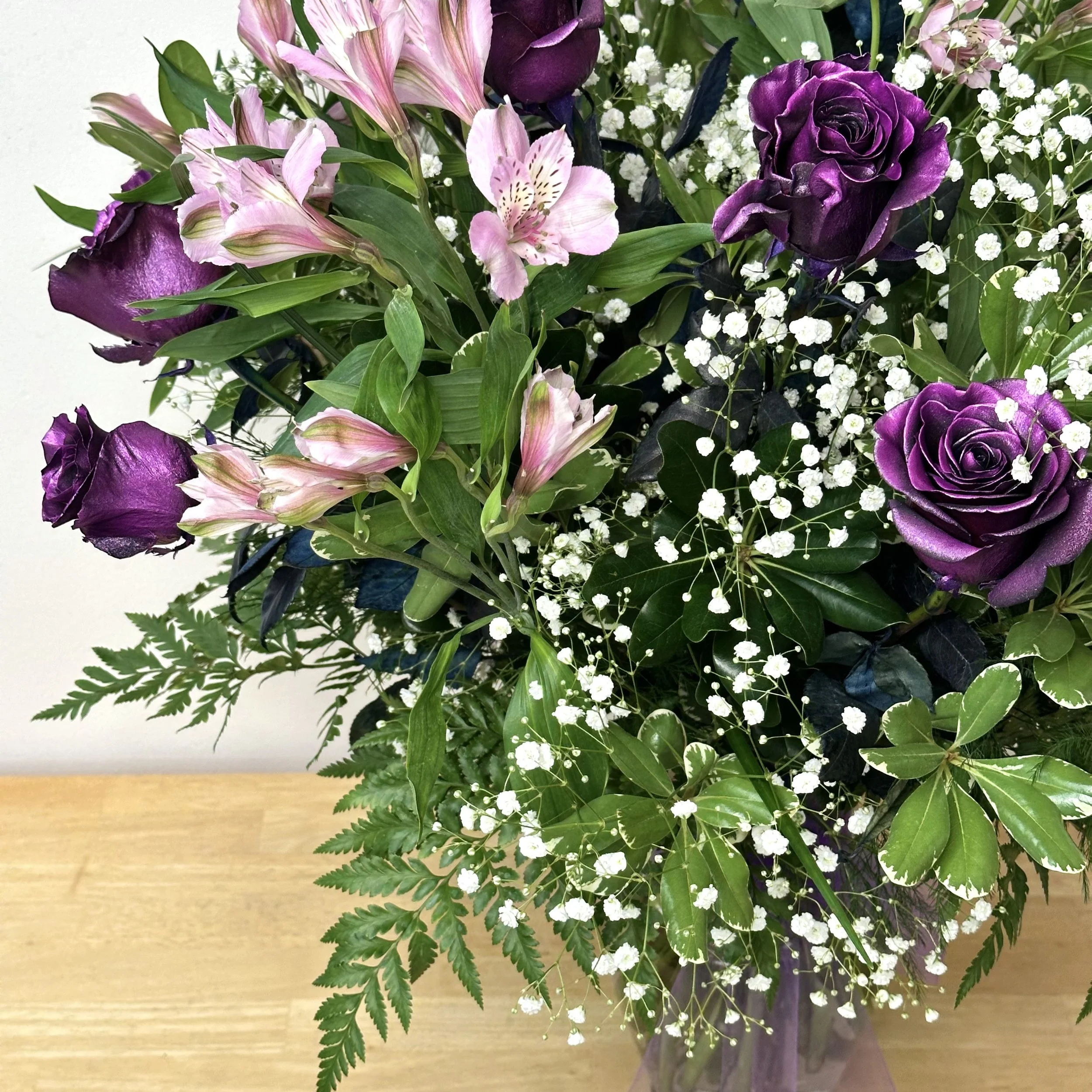 A classic rose arrangement featuring one dozen long-stem purple metallic roses, accent flowers, baby’s breath, and greenery displayed in a glass vase with coordinating bow.